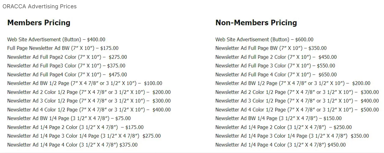 * No other sizes can be accepted. ORACCA reserves the right to reject and refuse to publish advertising it deems unacceptable. Banner Advertising: A fee of $175.00 is charged to place each prepared banner ad. (Ads can be in a HTML5, GIF, MP4 format for animation or JPEG, PNG for non animated – static). Online Advertisement Registration Form coming soon!